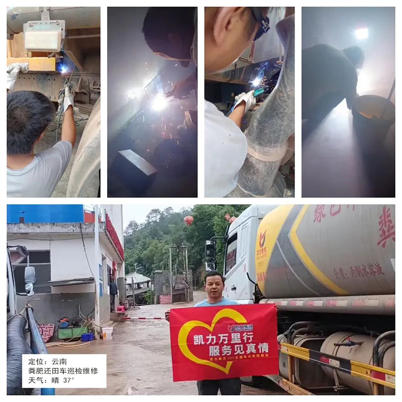 云南,售后人員接到三年前的老客戶電話,驅車一百多公里,對客戶車輛進行全方位體檢,冒著四五十度的罐內高溫進入罐內檢查,對于車輛脫焊位置進行補焊。