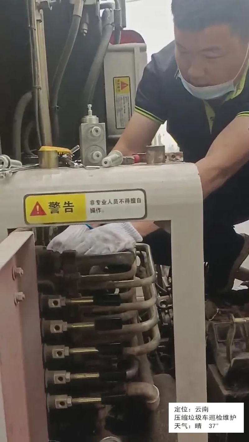 云南,售后人員對于客戶壓縮垃圾車進行巡檢和日常保養(yǎng)知識講解。