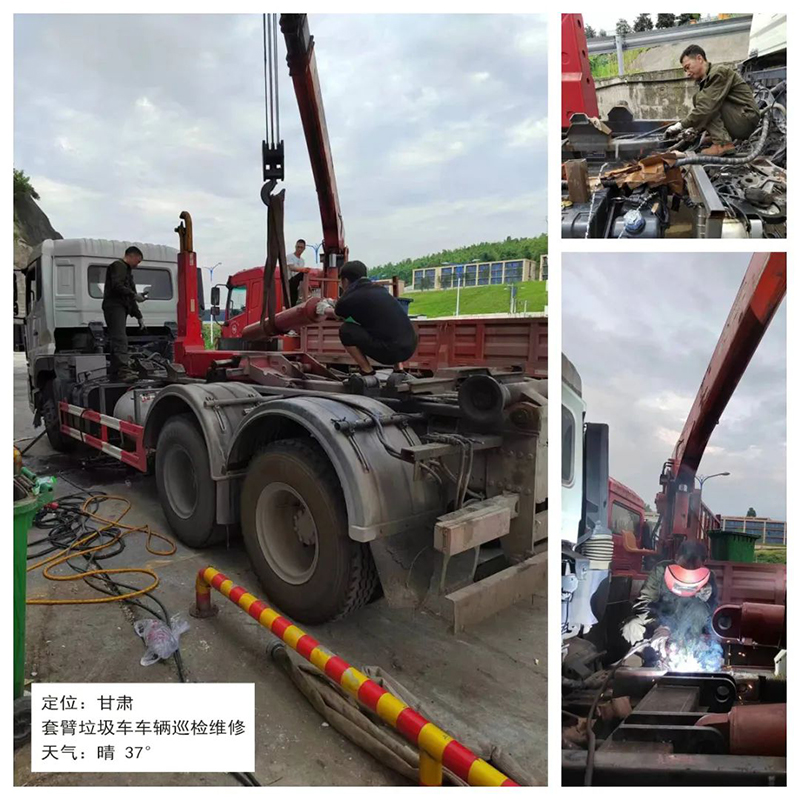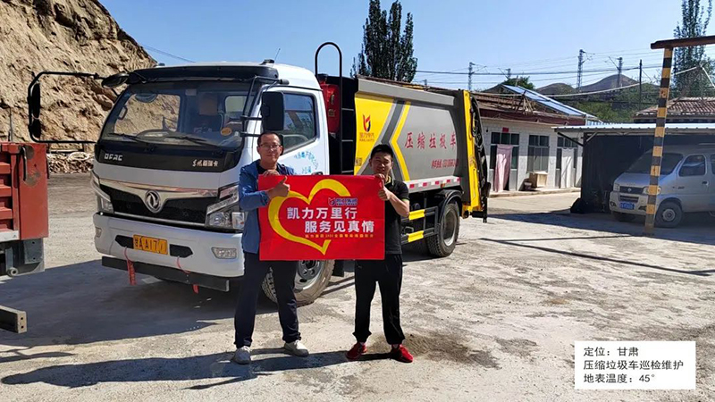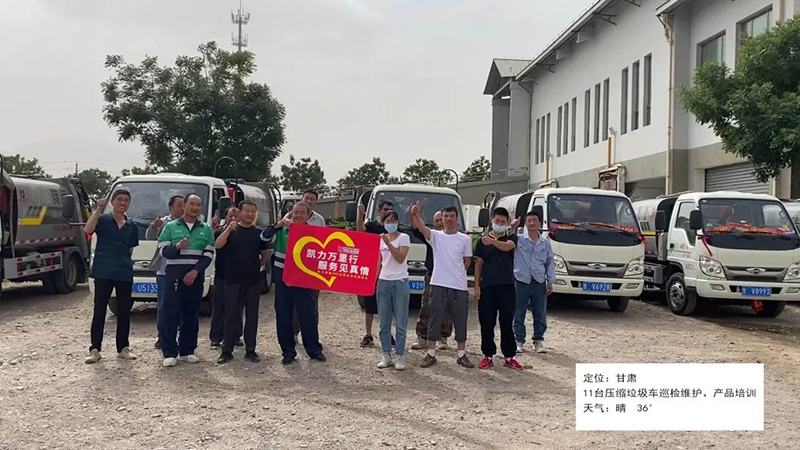 甘肅,36度高溫天氣,地表溫度達到45度以上,售后團隊頂著烈日,對十余臺壓縮垃圾車進行車輛巡檢、維護、操作培訓以及答疑解惑。