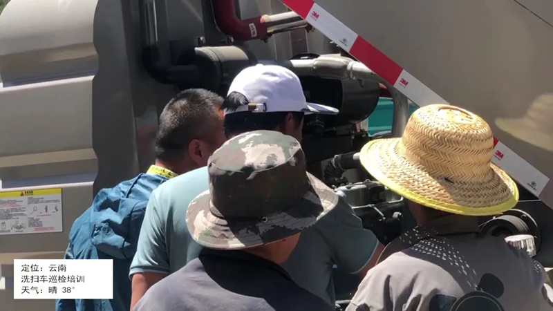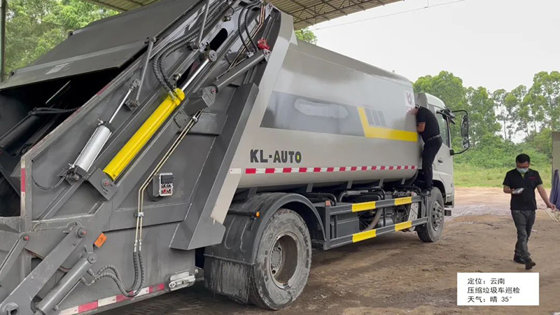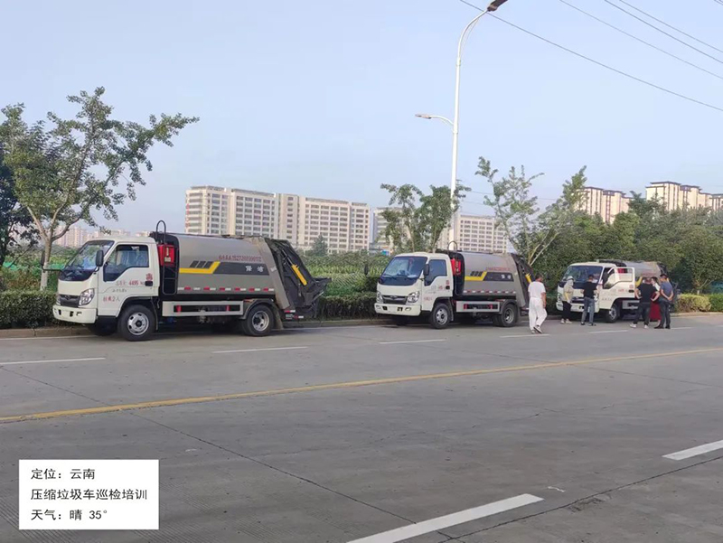 云南,售后人員進行車輛巡檢,對于客戶壓縮垃圾車輛進行現(xiàn)場產品培訓和講解日常保養(yǎng)。