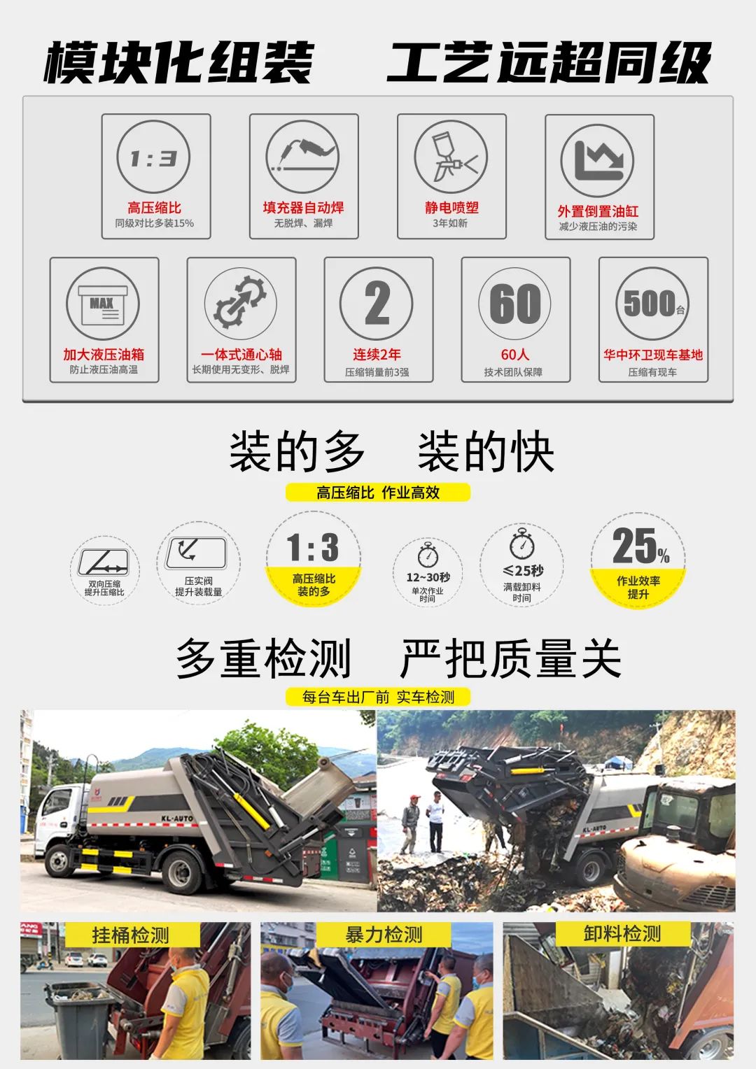 凱力風(fēng)新款垃圾壓縮車采用雙向壓縮原理設(shè)計(jì),壓填力高,垃圾壓縮密度大。同等條件下實(shí)現(xiàn)比傳統(tǒng)車型多裝近2噸垃圾。利用雙泵合流技術(shù),作業(yè)效率提升,降低用戶作業(yè)時(shí)長(zhǎng)。高壓縮率、大裝載量、作業(yè)效率快、防滴漏能力突出,與傳統(tǒng)壓縮式垃圾車相比,車輛壓填力、破碎力、填料器容積、輕量化方面大幅度提升,更加貼近市場(chǎng)“多拉快跑”的作業(yè)需求,尤其是適合小車對(duì)接上料、鏟車上料等特殊作業(yè)場(chǎng)景。