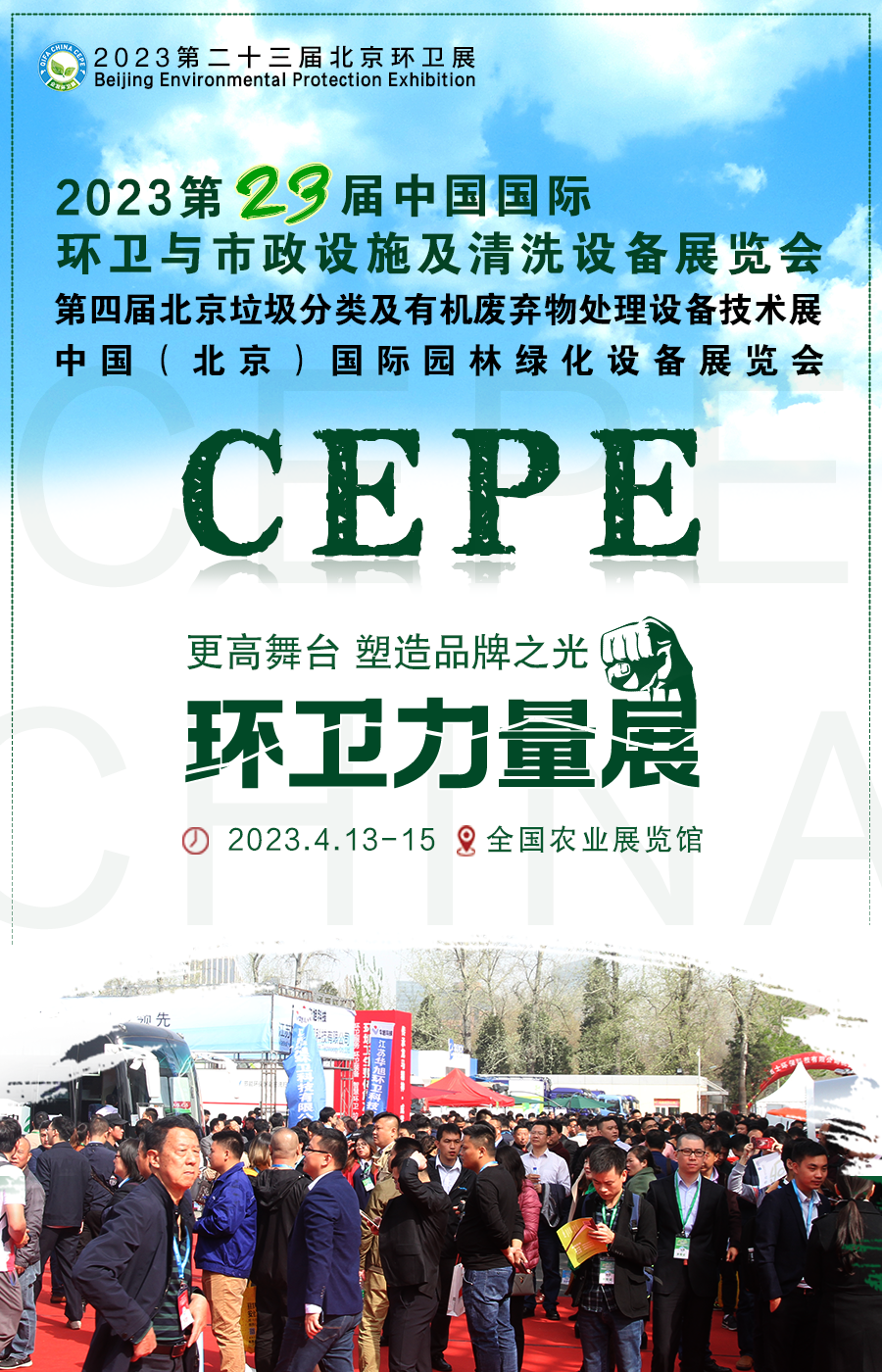 行業(yè)內(nèi)極具影響力的企發(fā)環(huán)衛(wèi)展CEPE China 在北京已成功舉辦了22屆,被譽為亞洲環(huán)衛(wèi)行業(yè)旗艦展,展會多年來得到住建部、生態(tài)環(huán)境部、城管局、園林局、多個省市環(huán)協(xié)以及北京市多個局委與市政府的大力支持。展會力爭發(fā)揮津京冀協(xié)同發(fā)展區(qū)域優(yōu)勢、輻射全國環(huán)衛(wèi)行業(yè)市場,旨在通過環(huán)衛(wèi)設備展示和信息發(fā)布等多種形式,加強本行業(yè)的交流與合作,為了更好地服務參展商,主辦單位加大宣傳力度,著重邀請全國環(huán)衛(wèi)局、園林局、環(huán)衛(wèi)中心、環(huán)衛(wèi)服務公司、清洗保潔公司、物業(yè)公司、環(huán)境工程公司、旅游景區(qū)、高校等環(huán)衛(wèi)設備相關用戶到會參觀、采購,預計展會面積50000多平方米,參展商500多家,專業(yè)觀眾將達到30000多人次,CEPE是引導環(huán)衛(wèi)行業(yè)前進和發(fā)展方向的高質(zhì)量展覽會。是全國乃至全球年度極具規(guī)模的環(huán)衛(wèi)行業(yè)旗艦展。本屆環(huán)衛(wèi)展聚焦“垃圾分類新技術,展示中國環(huán)衛(wèi)新裝備”的展會定位,以“環(huán)衛(wèi)力量展”為主題,以“創(chuàng)新應萬變,以實干謀發(fā)展”為指導,總體呈現(xiàn)“三高”的特點: