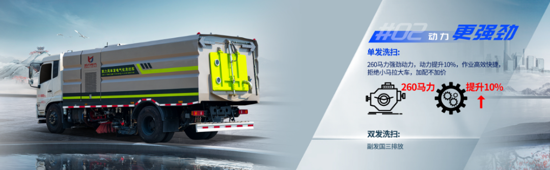 單發(fā)電氣化洗掃車(chē)底盤(pán)動(dòng)力260馬力,較雙發(fā)車(chē)型230馬力動(dòng)力提升10%,作業(yè)效率更高效快捷,拒絕小馬拉大車(chē),加配不加價(jià)。