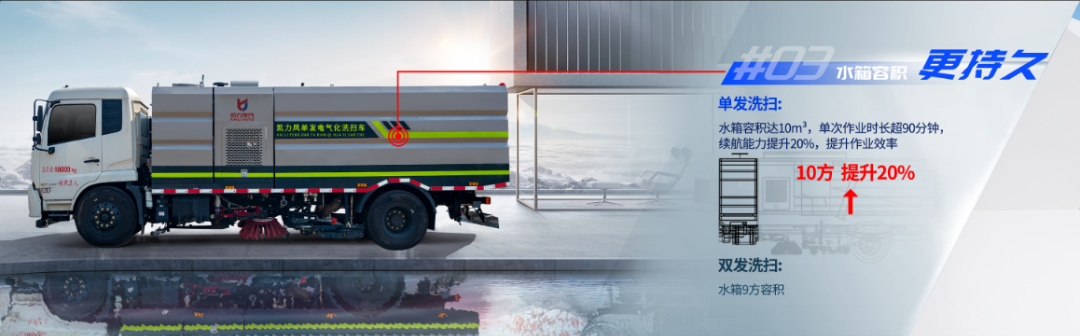 單發(fā)電氣化洗掃車(chē)水箱容積由雙發(fā)車(chē)的9立方加大到10立方,單次作業(yè)時(shí)長(zhǎng)超90分鐘,續(xù)航能力提升20%,續(xù)航能力更強(qiáng),作業(yè)效率更高。