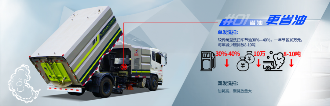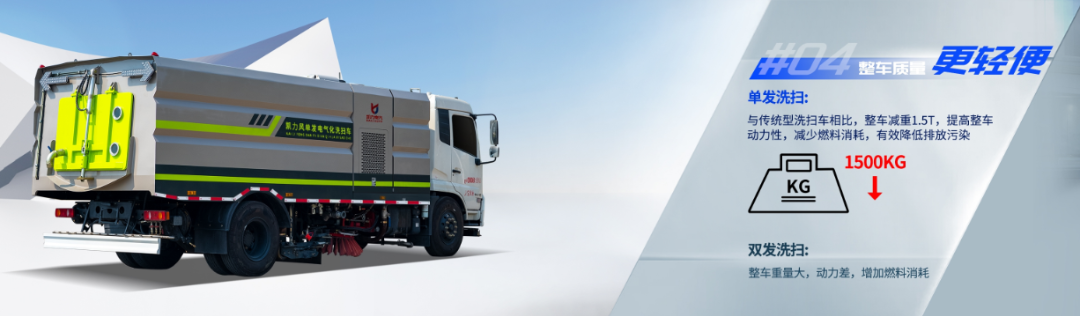 單發(fā)電氣化洗掃車(chē)整車(chē)減重1.5T,整車(chē)動(dòng)力性更強(qiáng),燃料消耗也有所降低,排放污染也相應(yīng)減少。雙發(fā)車(chē)相比單發(fā)車(chē)整車(chē)重量大,燃料消耗大,排放也大。