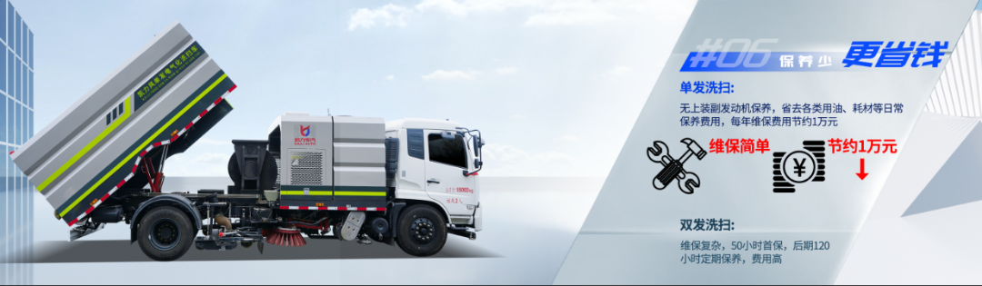 單發(fā)電氣化洗掃車(chē)無(wú)副發(fā)動(dòng)機(jī)保養(yǎng),省去各類(lèi)用油、耗材等日常保養(yǎng)費(fèi)用,每年維保費(fèi)用節(jié)約1萬(wàn)元。而雙發(fā)洗掃車(chē)維保復(fù)雜,50小時(shí)首保,后期100小時(shí)定期保養(yǎng),費(fèi)用高。