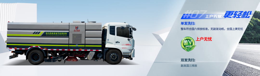 單發(fā)電氣化洗掃車(chē)整車(chē)符合國(guó)六排放標(biāo)準(zhǔn),無(wú)副發(fā)動(dòng)機(jī),全國(guó)上牌無(wú)憂(yōu),上戶(hù)更輕松。雙發(fā)車(chē)副發(fā)國(guó)三排放。