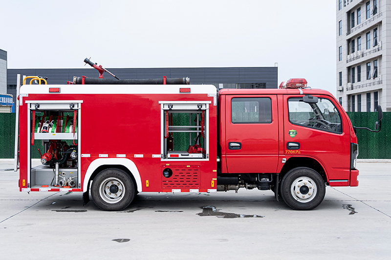 總體布置 | 整車由消防員乘員室和車身兩大部分組成,車身布置采用外露罐式結(jié)構(gòu), 左右兩側(cè)為器材箱,中部為水罐,器材箱后部為泵房。 |